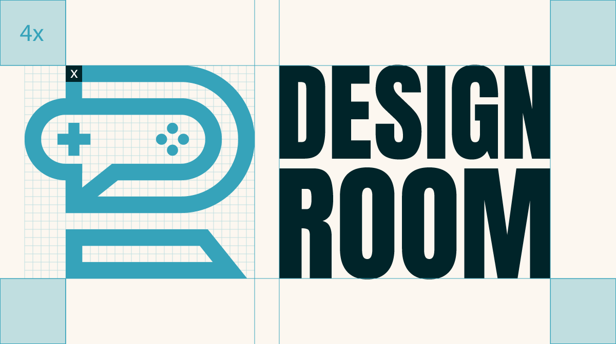 Symbolen är en blandning mellan D och R samt en spelkontroll formad som en pratbubbla för att betona de muntliga samtalen och berättandet kring spel, vilket Design Room fokuserar på. Jag valde en kompakt sans serif till namnet för att komplettera symbolen.